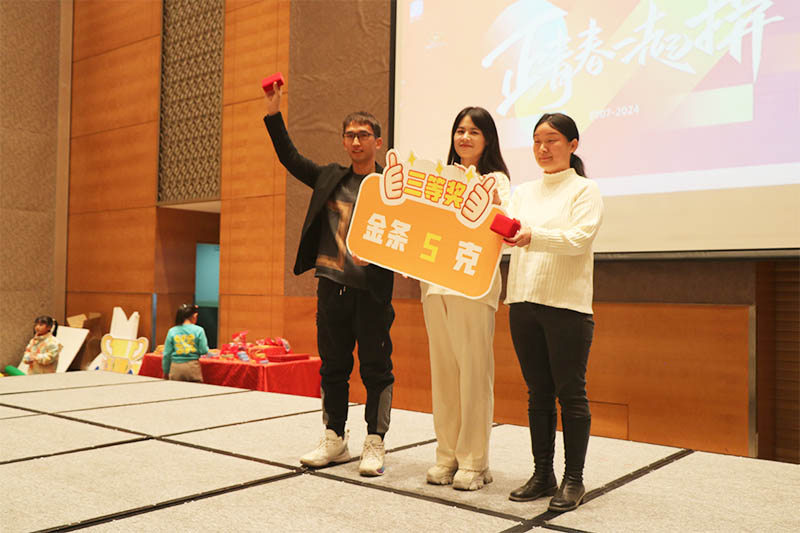 隨著三等獎(jiǎng)的抽出,晚會(huì)氣氛達(dá)到一個(gè)小高潮。幸運(yùn)兒們滿心歡喜地領(lǐng)取了獎(jiǎng)品5克金條。